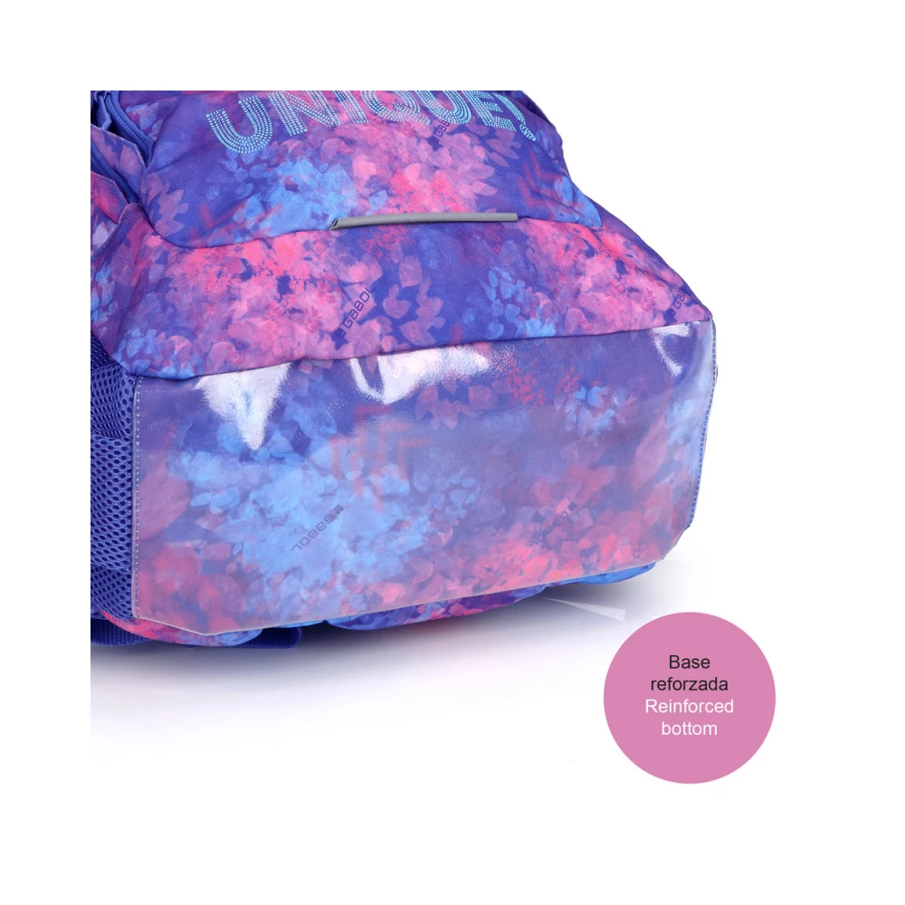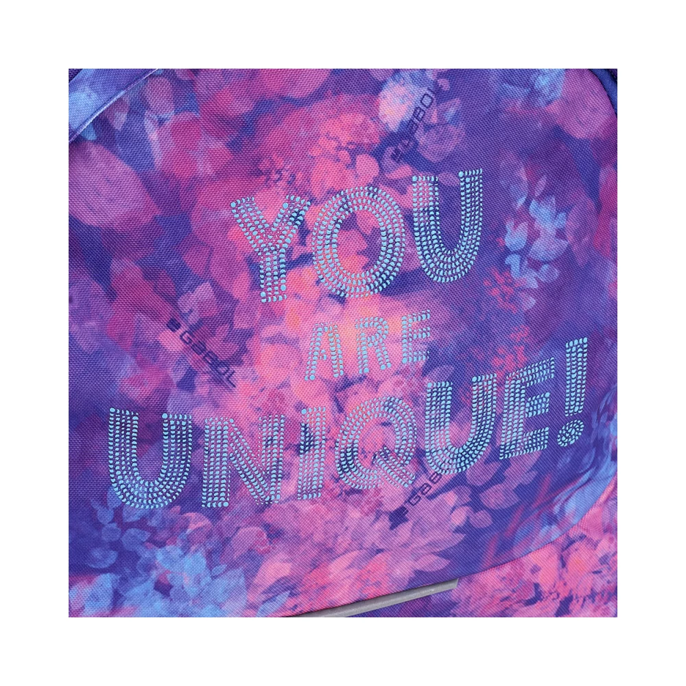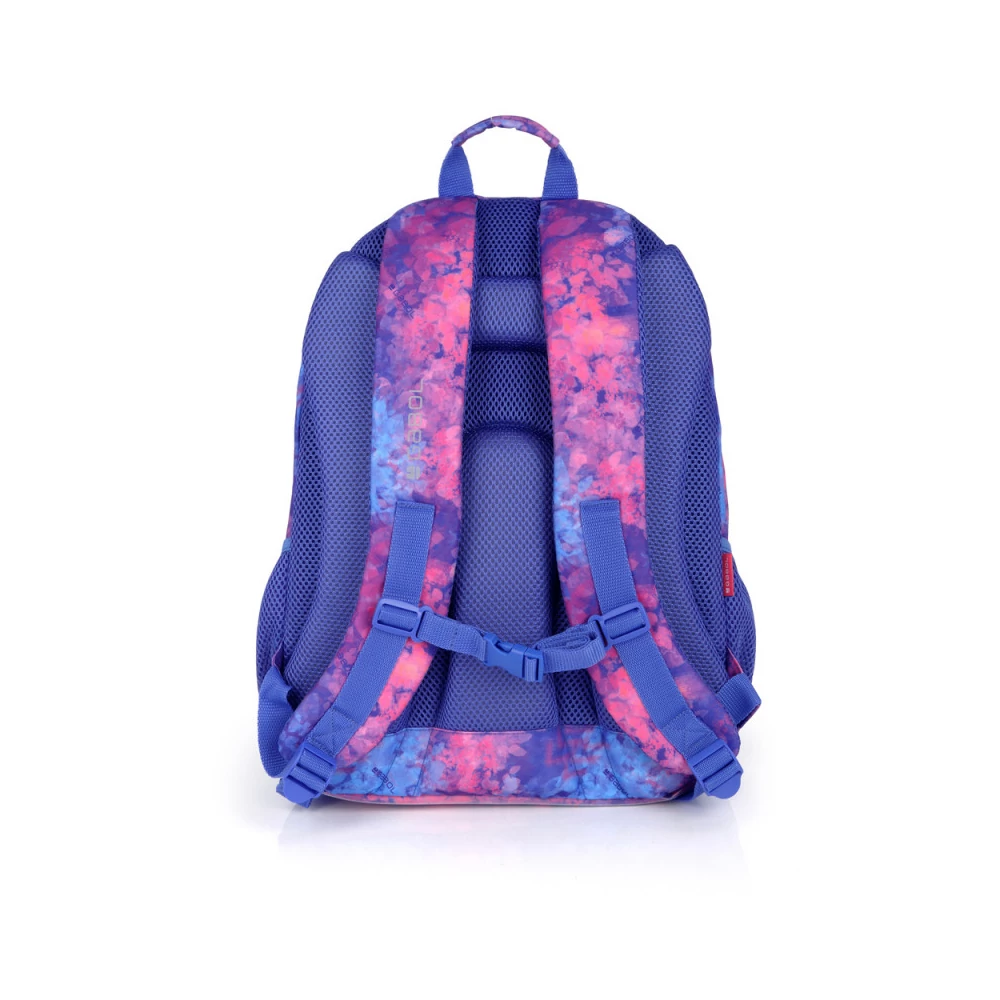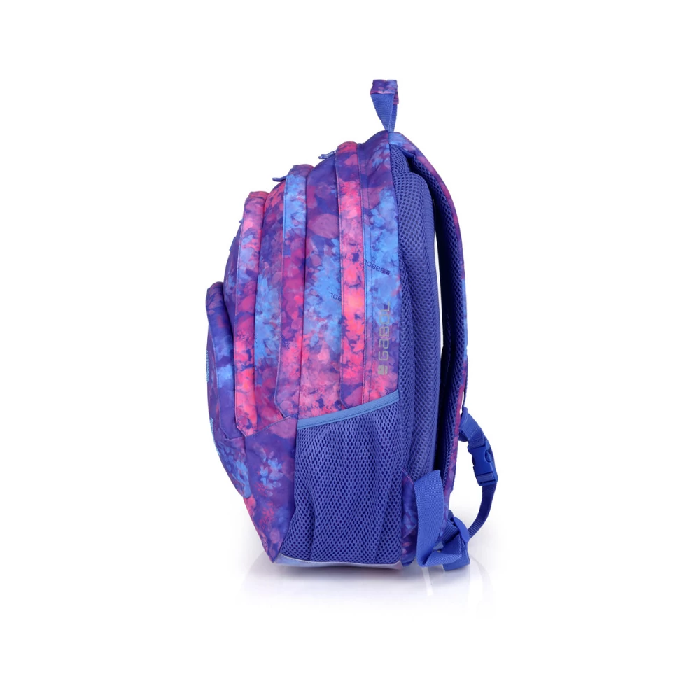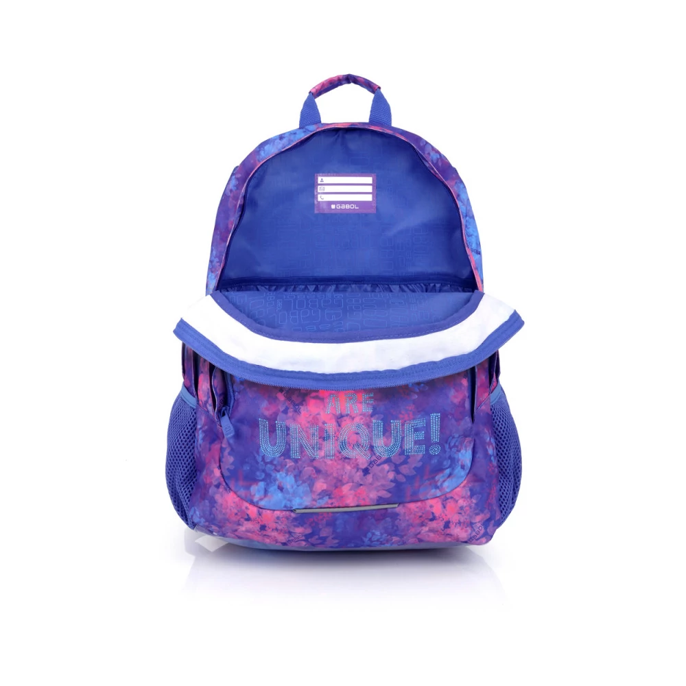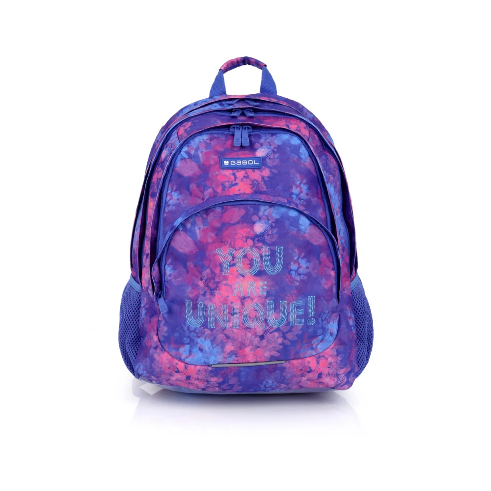 Gabol Sunset hátizsák. Ergonomikus hátrésszel és szivacsos vállpánttal rendelkezik, de kézben is hordható. A hátizsáknak két fő és két mellékrekesze van, valamint mindkét oldalán gumírozott zseb található a kulacsnak és egyéb tárgyaknak. Nagyobbik rekeszében névcímke is van, itt tárolhatjuk a mappákat, nagyobb füzeteket. A két elülső mellékrekesz alkalmas egyéb iskolai dolgaink, valamint személyes tárgyaink tárolására. 10 cm-es fényvisszaverő csíkkal a jobb láthatóságért.
