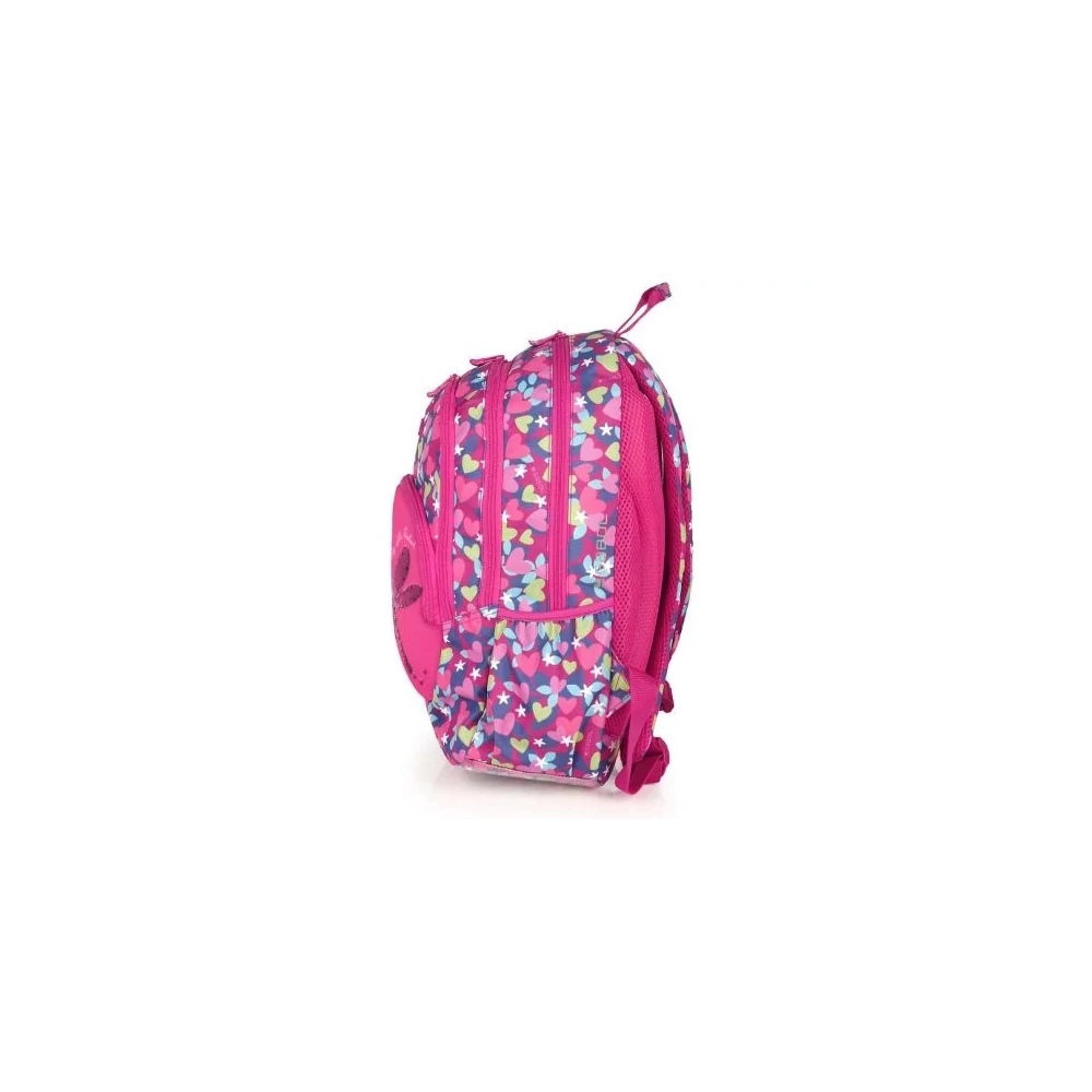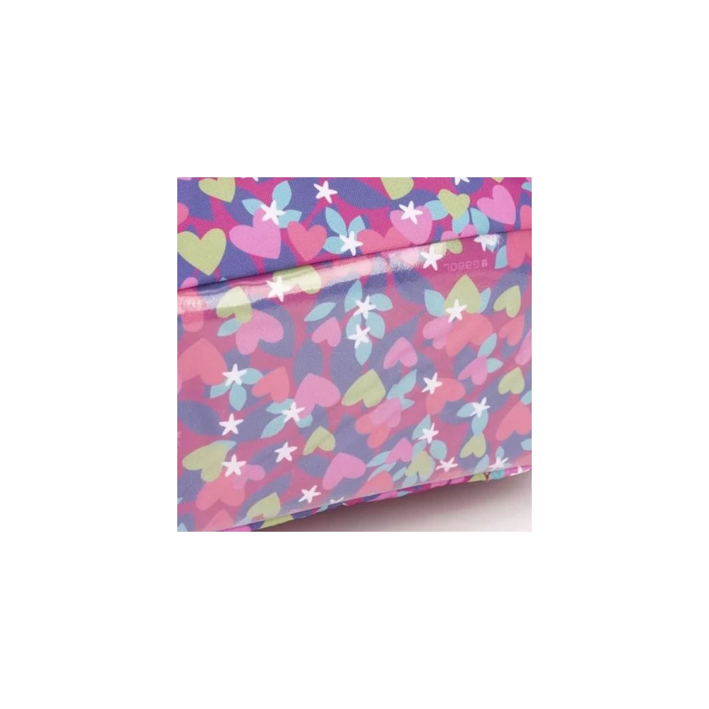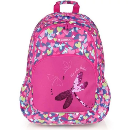 Gabol Wings hátizsák. Ergonomikus hátrésszel és szivacsos vállpánttal rendelkezik, de kézben is hordható. A hátizsáknak két fő és két mellékrekesze van, valamint mindkét oldalán gumírozott zseb található a kulacsnak és egyéb tárgyaknak. Nagyobbik rekeszében névcímke is van, itt tárolhatjuk a mappákat, nagyobb füzeteket. A két elülső mellékrekesz alkalmas egyéb iskolai dolgaink, valamint személyes tárgyaink tárolására.